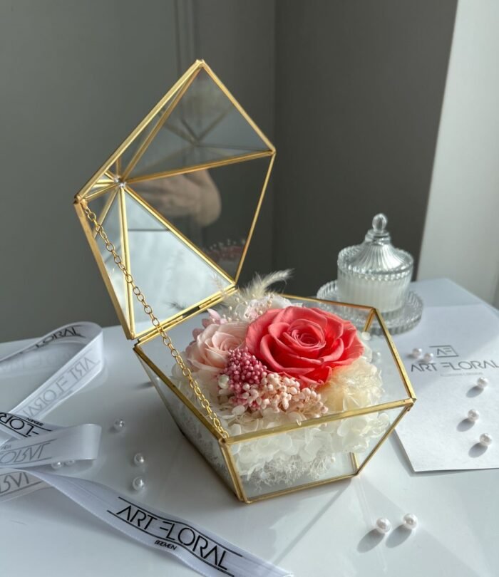 Das Terrarium im Schatullenformat präsentiert sich als wahres Juwel und verleiht dem Blumenarrangement einen Hauch von zeitloser Eleganz.