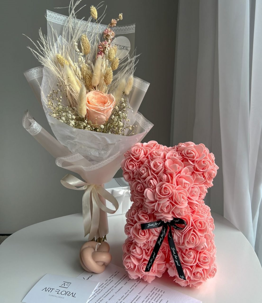 Eine Box mit Infinity Rosen und Trockenblumen, Baumwolle, Eukalyptus, Lagurus und Disteln. Ein stilvolles und elegantes Geschenk für besondere Anlässe wie Geburtstage, Valentinstag oder Muttertag.